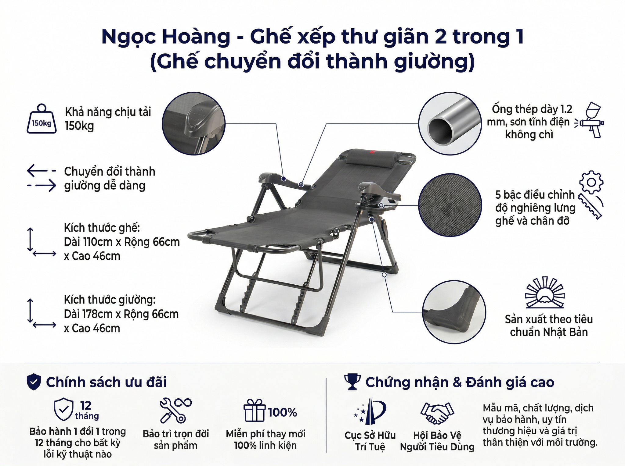 Làm việc cả ngày mệt mỏi, trưa muốn ngả lưng chút cho đỡ đau cột sống mà chỗ chật quá? Hay các cô chú lớn tuổi hay bị trào ngược dạ dày, rối loạn tiền đình nằm nệm phẳng khó chịu? Ghế xếp thư giãn đa năng 2 trong 1 Ngọc Hoàng sinh ra là để giải quyết thực tế những vấn đề đó. Vừa làm ghế ngồi xem tivi, chớp mắt cái là ngả ra thành giường nằm êm ái, xếp lại thì gọn hơ trong góc nhà. Đồ nhà làm, Ngọc Hoàng bán từ năm 1999 tới giờ, chú trọng cái chất lượng thực dụng, chắc chắn chứ không hoa mỹ.