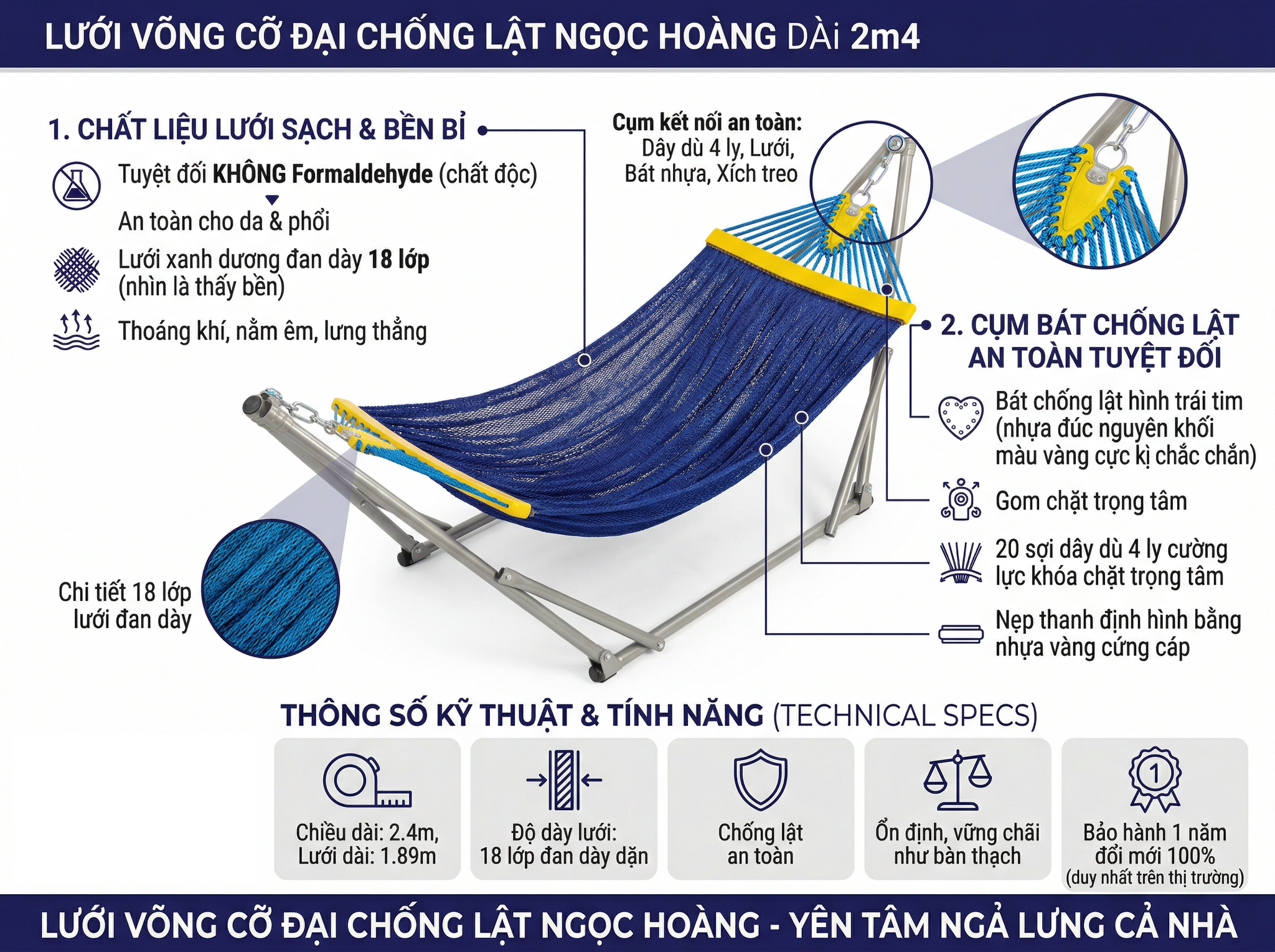 Nằm võng sợ nhất là cảm giác chòng chành, dễ lật hay đứt dây té ngã, đặc biệt với nhà có người lớn tuổi và trẻ nhỏ. Chưa kể nhiều loại lưới rẻ tiền nhuộm hóa chất, nằm lâu hay bị ngứa ngáy, hầm bí. Hiểu rõ thực tế đó, Ngọc Hoàng sản xuất dòng lưới võng cỡ đại chống lật 2m4. Hàng công ty làm ra chú trọng chất lượng thật: nằm êm, lưng thẳng, vững chãi như bàn thạch để cả nhà yên tâm ngả lưng mỗi trưa hè.